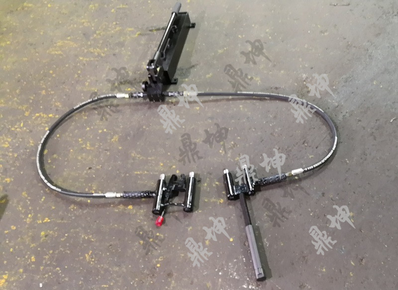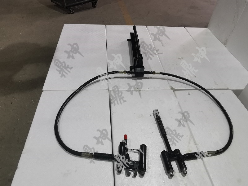 该机具主要由手动液压泵、快速接头、高压软管、销钉拔出工作头和销钉顶出工作头组成。销钉拔出工作头由双柱塞顶推油缸和销钳组成;销钉顶出工作头由双柱塞顶推油缸和顶杆组成。该机具由于拔出工作头设计上采用双顶推油缸,夹钳处在双顶推油缸的中间位置,且在同一平面上,柱塞与销钳受力均匀。为了解决拆卸一-些锈蚀很严重的销钉,拔的同时在销钉的尾部特增加一套顶出工作头,使作用在销钉的作用力增加了一倍,完全满足了作业要求。换向使用时,由于两工作头匀对称设计,正反安装无需重新连接高压油管。本机具有结构紧凑、安装操作方便、受力合理、使用寿命长等特点。